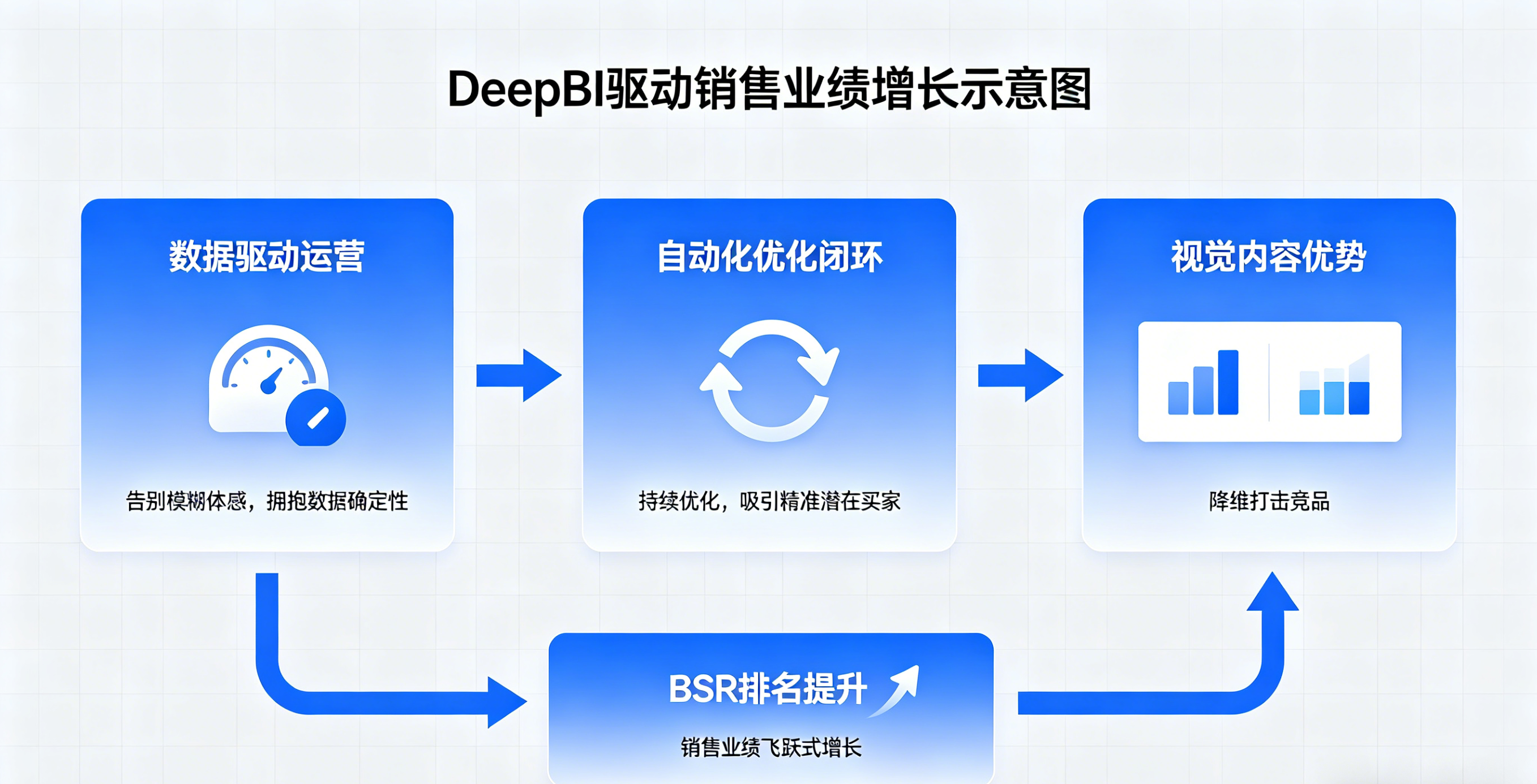 借助 DeepBI,卖家能够告别模糊的运营体感,拥抱由数据驱动的确定性增长。通过持续的、自动化的优化闭环,您不仅能吸引更多精准的潜在买家,更能以压倒性的视觉与内容优势实现对竞品的降维打击,最终显著提升 BSR 排名,实现销售业绩的飞跃式增长。